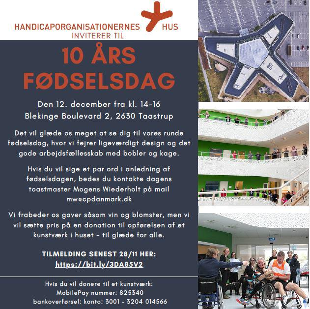 Cystisk Fibrose Foreningens sekretariat har til huse i Handicaporganisationernes Hus i Høje Tåstrup og du er inviteret med, når husets 10-års fødselsdag, ligeværdigt design og det gode arbejdsfællesskab fejres mandag den 12. december fra klokken 14-16. Der vil være bobler, kage og taler. Se invitationen herunder.