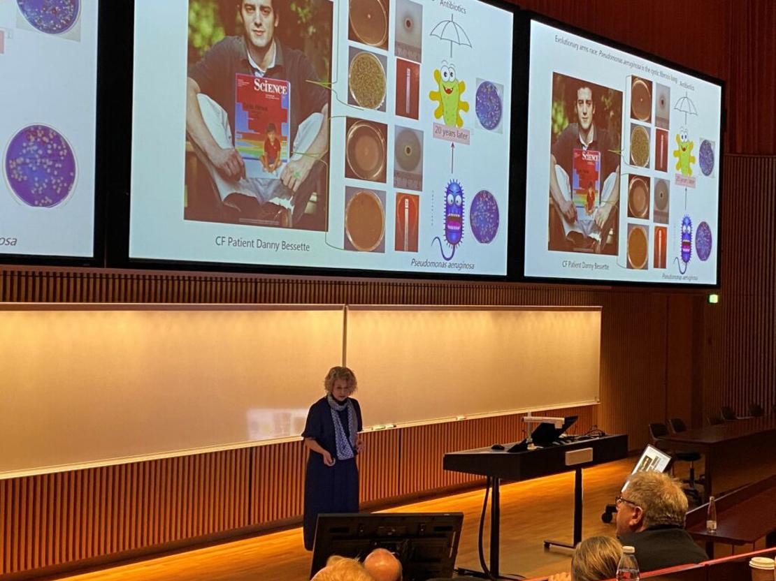 Oana Ciofu holdt i fredags sin indsættelsesforelæsning som professor i antimikrobiel resistens ved Costerton Biofilm Center, Institut for Immunologi og Mikrobiologi på Det Sundhedsvidenskabelige Fakultet, Københavns Universitet. Forelæsningen bød på en spændende fortælling om Oanas forskerkarriere, hvor hun har skarpt fokus på at forbedre behandling af kroniske bakterieinfektioner ved at forstå og udnytte bakteriers evolution og optimere antibiotikas effekt hos bakterier der danner en biofilm for at beskytte sig, hvilket ses hyppigt hos patienter med cystisk fibrose.