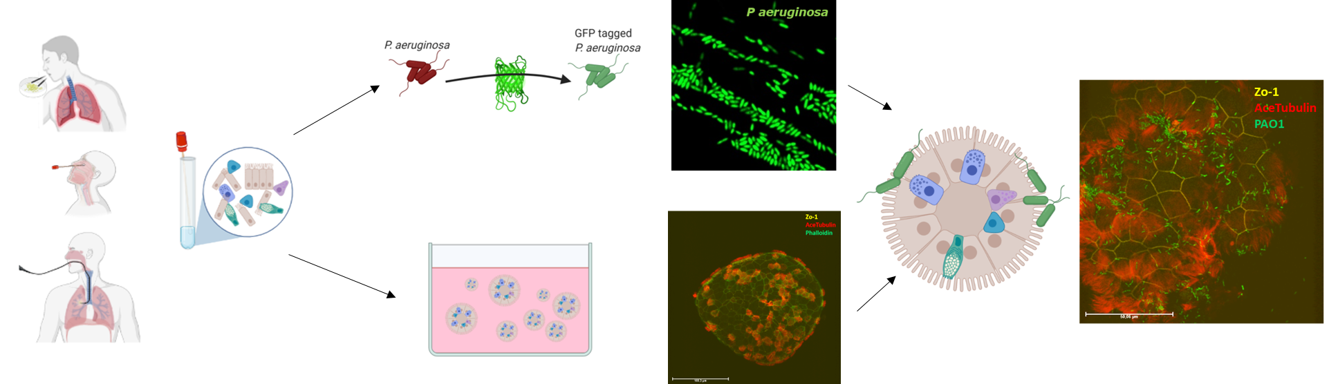 På billedet herunder ses en miniature lungemodel, der er inficeret med bakterien Pseudomonas aeruginosa. Fimrehårene, der hjælper med at rense luftvejene for slim er vist i rød. I gul kan man se grænserne mellem de individuelle lungeceller og i grøn er ses Pseudomonas aeruginosa-bakterier. Ved hjælp af mikroskopi kan man tage billeder af bakterierne mens de koloniserer modellerne og på den måde undersøge, hvordan bakterieinfektioner udvikler sig i lungerne.