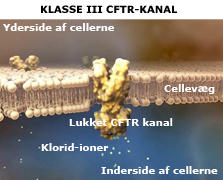 Patienter med klasse III mutationer har CFTR-kanaler ved overfladen af cellerne i luftvejene, men de kan ikke åbne og lede klorid-ioner og bikarbonat gennem kanalerne til cellernes yderside i lungerne, som det sker hos raske personer.