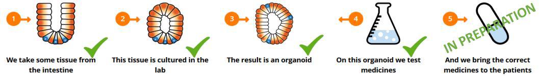 Screeningerne foretages på de såkaldte organoider eller ”mini-tarme”, som er kunstigt dyrkede organer, fremstillet med vævsprøver fra de 502 patienter, der er med i forskningsprojektet. Efter screening følger kliniske studier, hvor man tester de medicinkandidater, der viste god effekt på patienters organoider, på forsøgspersoner.