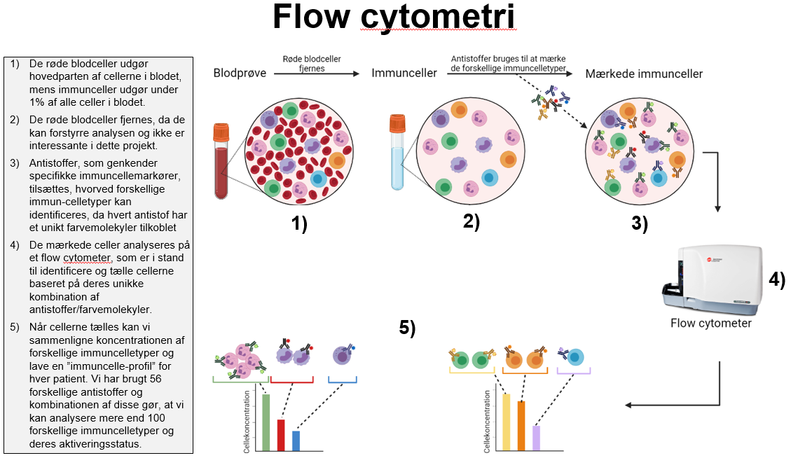 Den ene analysemetode, Mads Lausen Nielsen har brugt til at analysere blodprøverne, hedder flow cytometri. Ved hjælp af den, kan han måle den detaljerede sammensætning af forskellige immuncelletyper i blodet. I figuren herunder kan du se, hvordan man udfører blodprøveanalyse med flow cytometri.